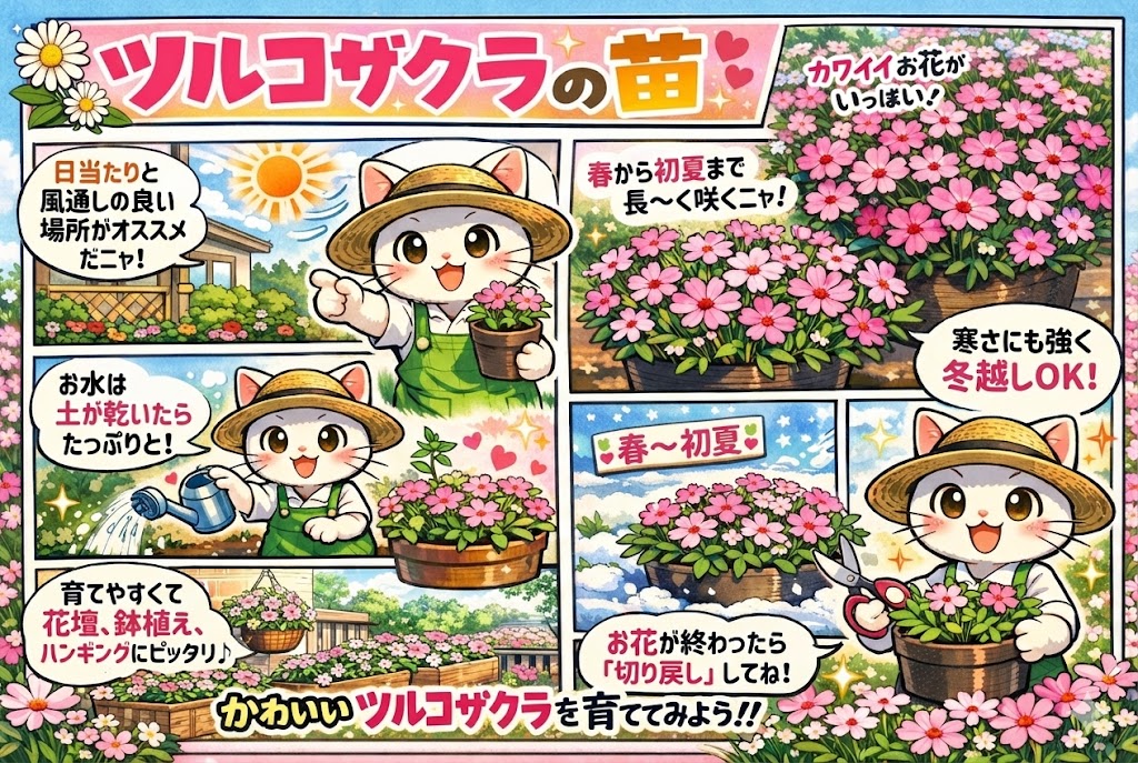 ツルコザクラ(シレネ)は、**「日当たり」と「水のやりすぎ注意」**さえ守れば、ガーデニング初心者さんでもビックリするくらい豪華に咲かせることができるニャ!🌸